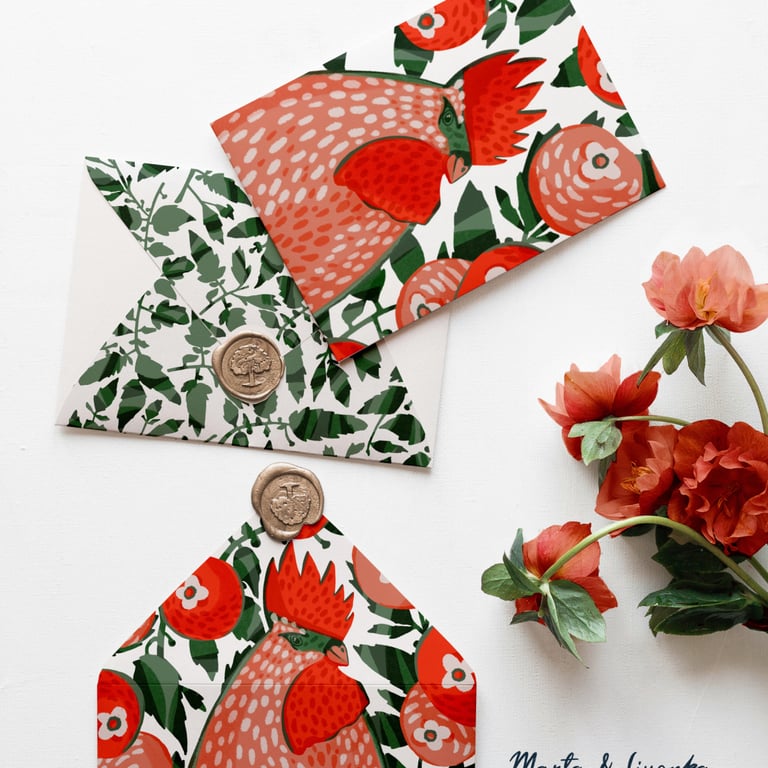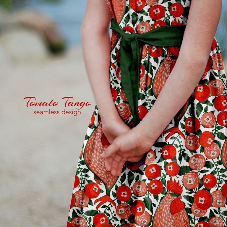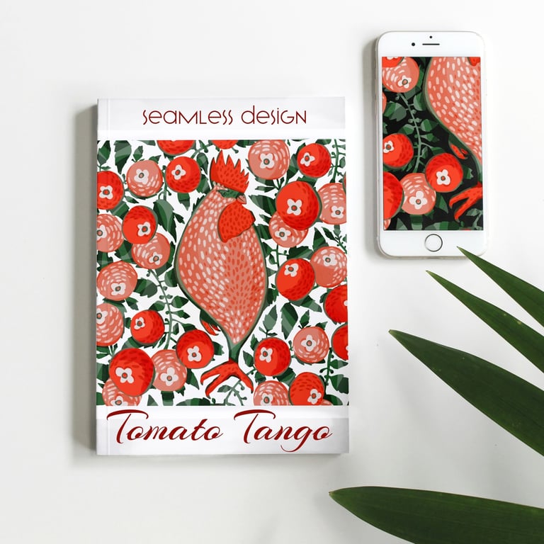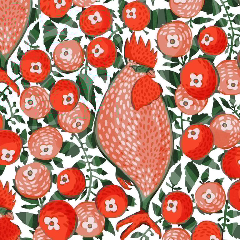 Seamless patterns in Chic Rustic style. Jiucy tomatoes & villlage Roosater reign