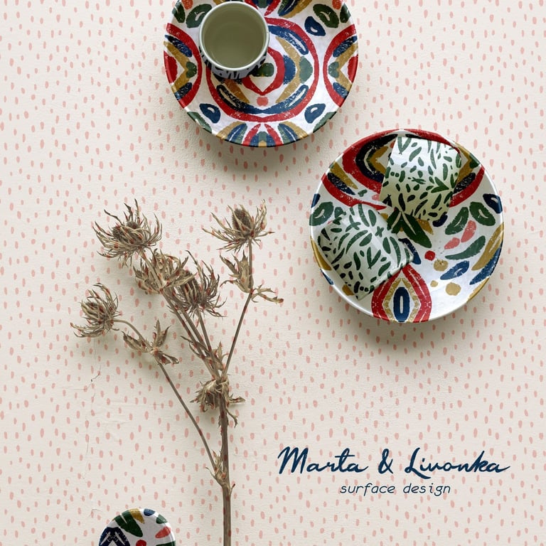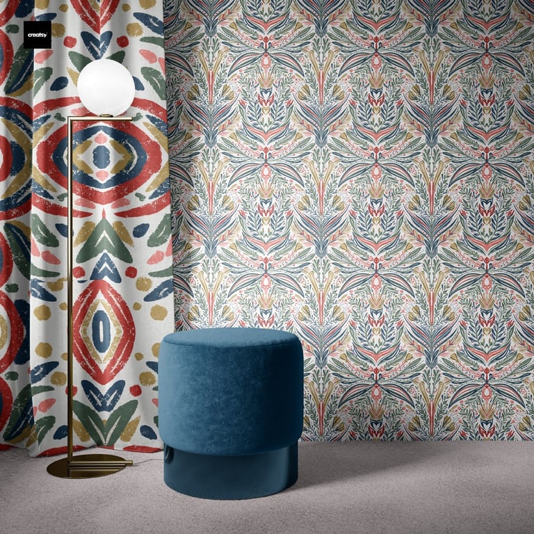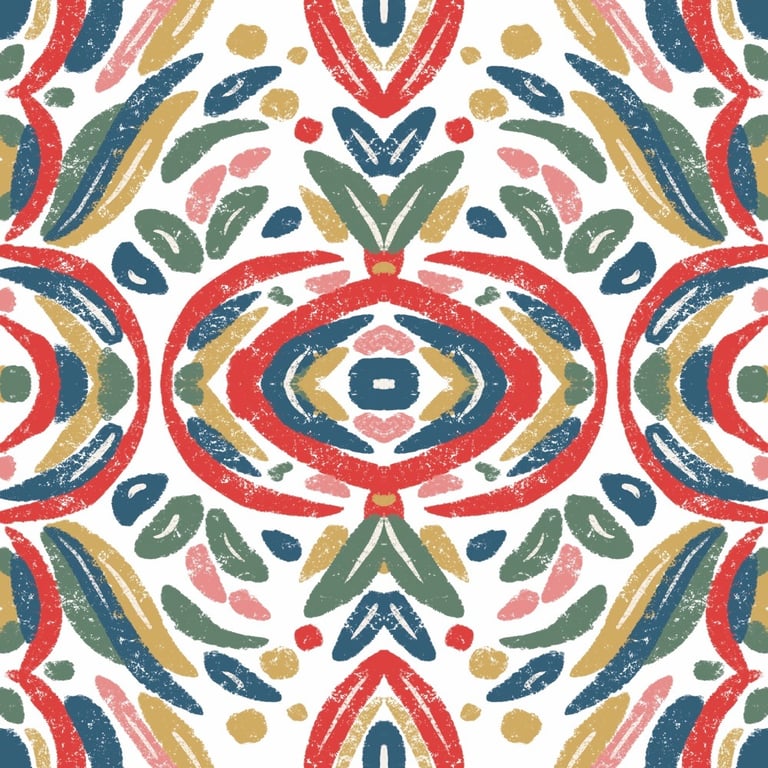 Seamless patterns in a modern Folk Art Deco style, created in crayon.